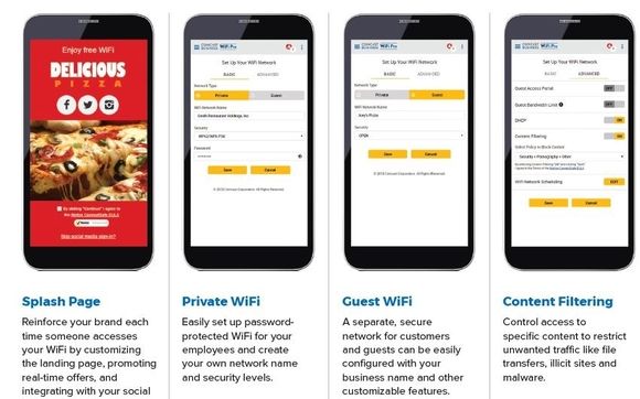 Comcast Business WiFi Pro. Of 3 smart Wifiboosters twv. Customizable splash page for business promotion.